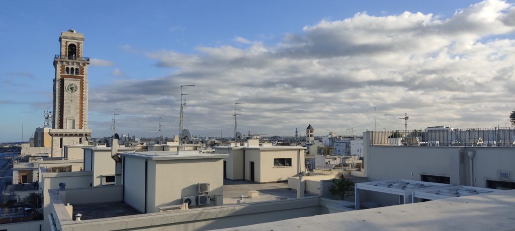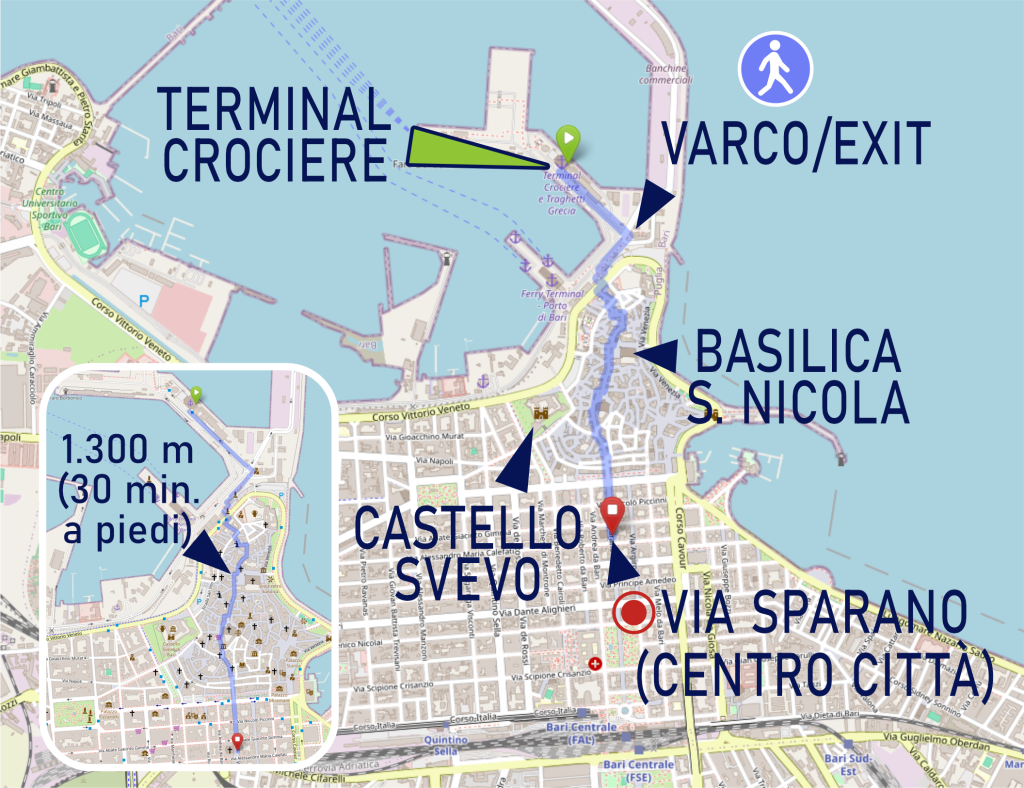 Dal Terminal crociere si raggiunge il centro della città (il quartiere murattiano, con le sue vie piene di negozi, con una passaggiata di circa 30 minuti, attaversando il centro storico, passando davanti alla Basilica di S. Nicola, alla Cattedrale, dedicata a S. Sabino e all’imponente castello svevo, oppure percorrendo la muraglia (via Venezia), quello che resta delle antiche fortificazioni della città, fino alla suggestiva piazza del Ferrarese,